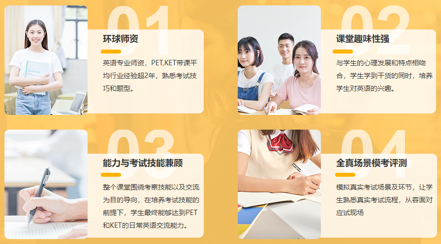 环球ket剑桥英培训班,KET和PET是剑桥通用英语考试中的前两级考试。在小 升初考试中,KET、PET证书被称为进入重点学校的“敲门砖”,另外这项考试也比较放心,证 书用途广泛,是学习者英语能力的有力证明。