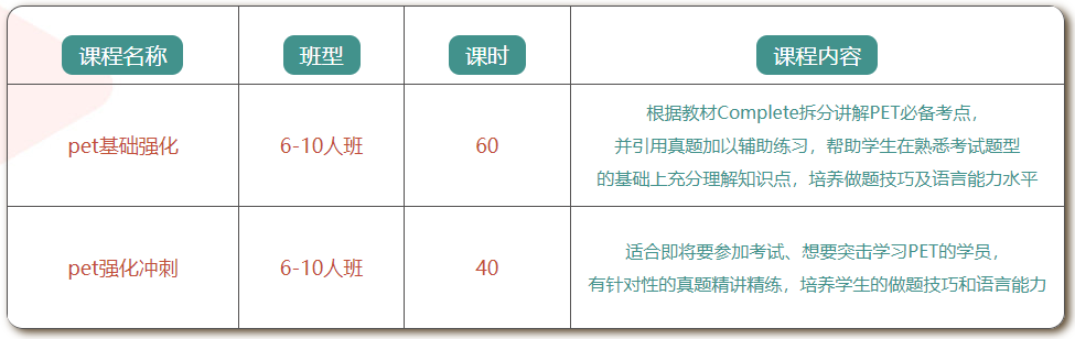 环球pet剑桥英培训班,PET全程班,旨在通过系统的教学和训练,帮助学生达到PET考试的合格标准,并全面提升其英语综合能力。课程内容涵盖了语法、词汇、阅读、写作、听力和口语等各个方面,采用多种教学方法和手段,激发学生的学习兴趣和积极性。通过PET全程课程的学习,学生能够进步自己的英语水平和PET考试成绩,为未来的学习和职业发展打下坚实的基础。